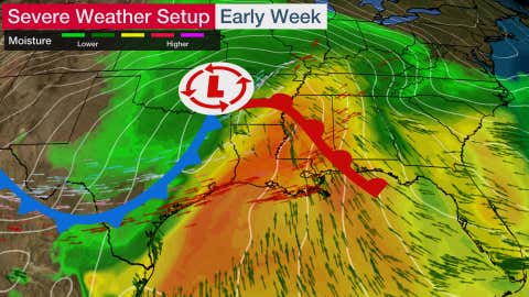 A low-pressure system will be tracking across the South and into the East for the first half of this week. Moisture from the Gulf of Mexico will surge northward ahead of the cold front associated with this system, increasing instability in the atmosphere.